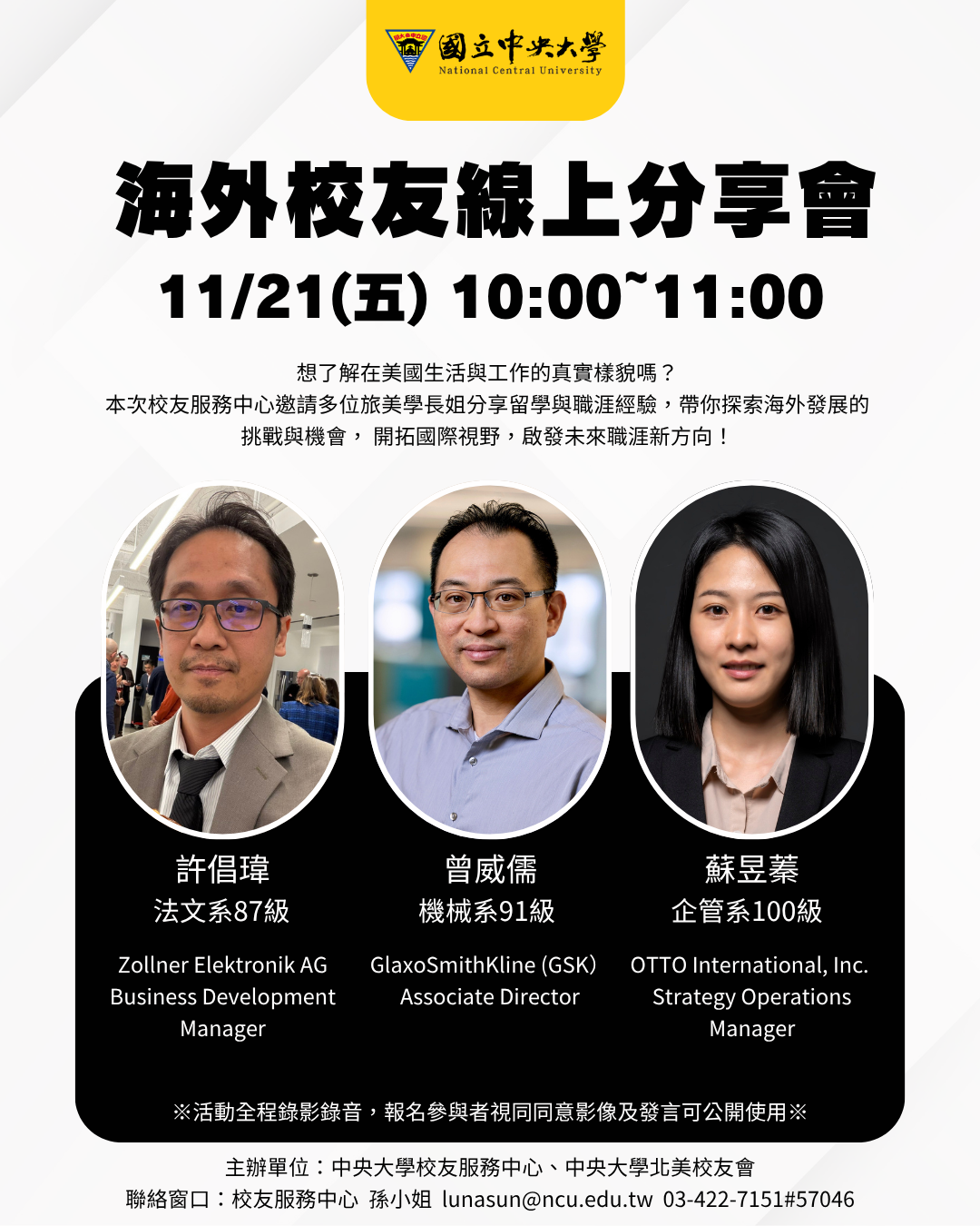 校友服務中心特別邀請多位旅美校友,與大家分享他們在異國打拼、